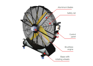 and to expel fumes and dust. The shift is facilitated by wheels equipped with position brakes; the presence of a safety net “under 14”, realized with robotic systems, guarantees the highest security standard. does not require installation, it is a plug and play fan ready to use and as such it is perfect in every context.